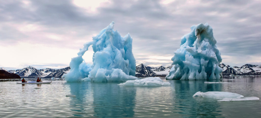 Deux icebergs de glace bleue incroyablement sculptés dérivent doucement au grès du vent et des courants,