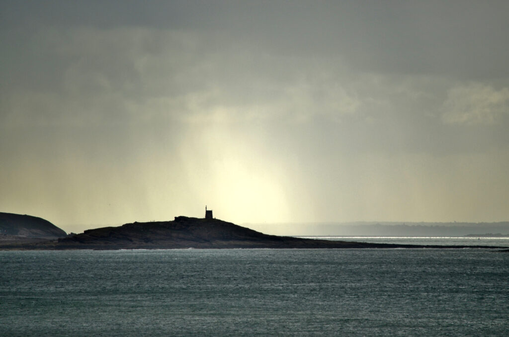 Ballade sur le sentier côtier non loin du cap Fréhel, l’été est bien agréable sous le soleil. Soudain le vent se lève, la pluie arrive, alors on presse le pas. Il fait de plus en plus froid et nous ne sommes pas assez couverts. Nous faisons demi-tour pour regagner la voiture rapidement. Et puis au loin nous apercevons une lueur qui donne de l’espoir. Elle est prise entre la terre, le ciel et l’eau déjà sombres. La tempête hésite à s’intensifier, c’est fantastique la lumière change tout.