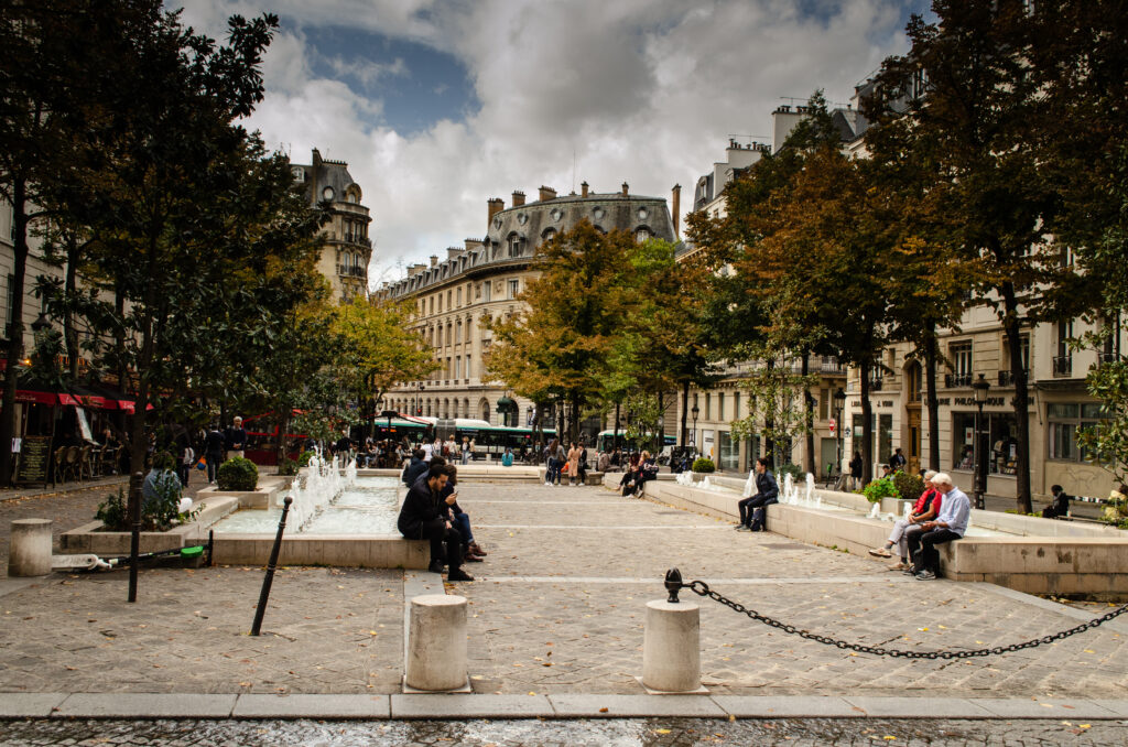 Faisant le tour du quartier en attendant l’heure de mon cours, je flâne tranquillement lorsque j’aperçois cette petite place. Je saisis l’instant rapidement pour ne pas me faire remarquer. Au fond la ville est animée, des bus circulent, des gens marchent ou discutent ensemble, d’autres sont assis à la terrasse d’un café. Au contraire sur le premier plan tout est calme, chacun semble se reposer, attendre, lire ou consulter son smartphone. Deux mondes semblent s’opposer, celui de la rue très actif et celui de la place immobile. Peut-être que le temps s’est suspendu un fragile instant entre l’été et l’automne place de la Sorbonne.