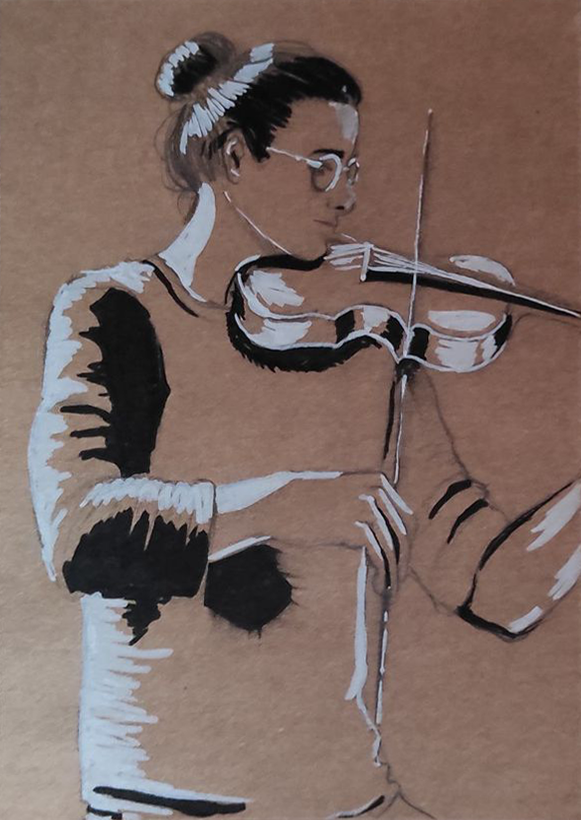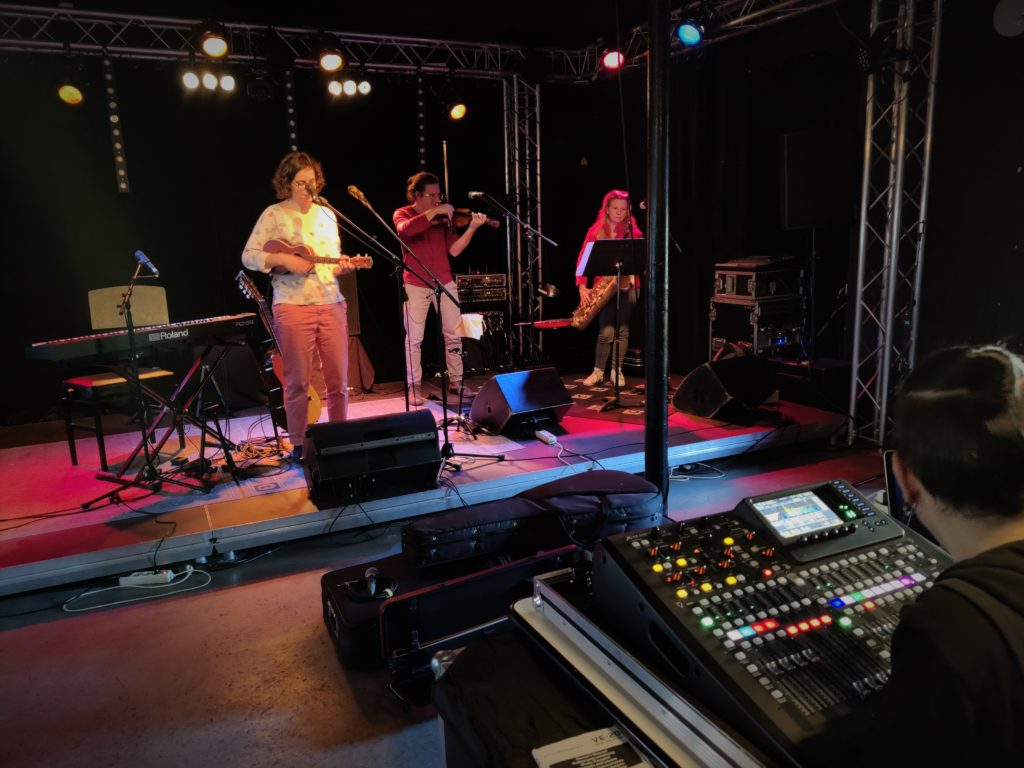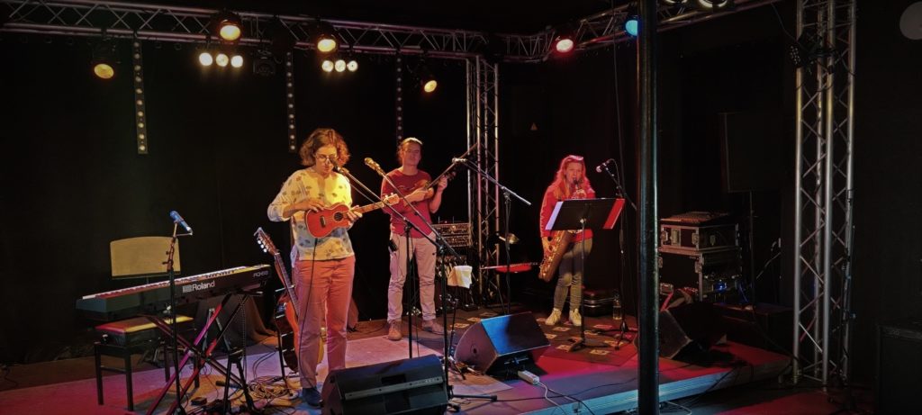 Au cours de ce deuxième jour de résidence le Trio se réuni et effectue un travail sur l’équilibre sonore des instruments. En effet, il s’agit de trouver un équilibre entre la voix principale accompagné du Ukulélé et les deux instruments qui l’accompagnent : violon et saxophone baryton.